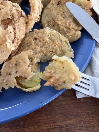 我终于吃到这个大名鼎鼎的菜肴。实话说,它味道一般般,不太知道这种比较湿润的果蔬是怎么被想到要去做成油炸食品的,裹着的外皮有点厚!但是作为情怀还是要吃的呢。只是我估计我以后不会想要再吃一次了吧,哈哈。